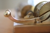 The large brass handle winds a pair of massive spring motors. Two motors means twice the playing time. Called a “longue marche” drive, it allows you to listen to the entire program twice without re-winding; about 16 minutes.